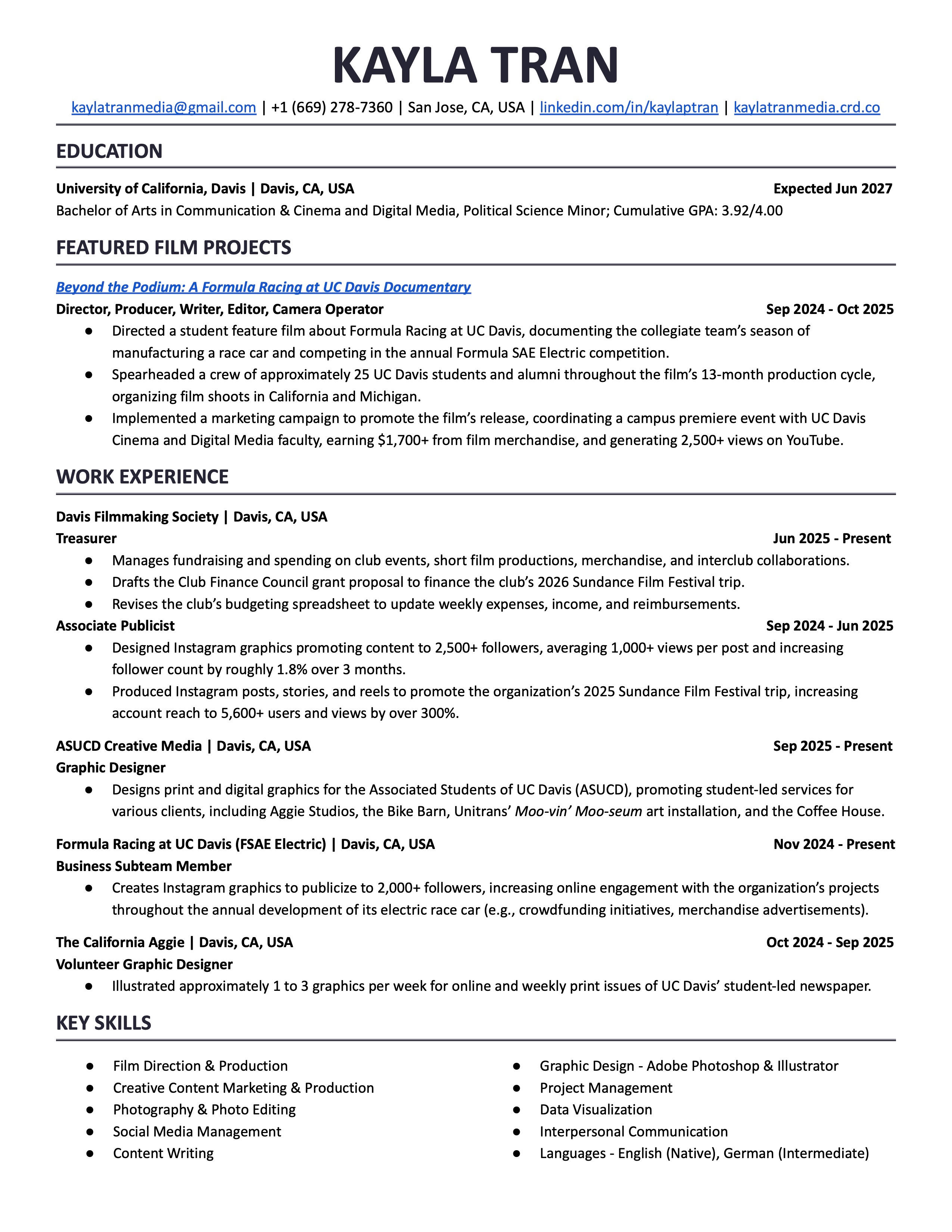 I'm a student filmmaker and graphic designer currently attending the University of California, Davis. Born and raised in San Jose, California, I developed an interest in entertainment and the performing arts from a young age, growing up with a passion for film and music.Beyond academics, I produce personal projects and content for various student-led organizations, directing films and creating marketing, publicity, and graphic design projects. I recently directed a feature-length documentary about Formula Racing at UC Davis (FRUCD), which premiered online on October 19th.Outside of work, I enjoy going to the cinema, playing the piano, watching sports, and staying educated about the world. You'll always find me looking for ways to be out and about, reaching and achieving my goals one day at a time.